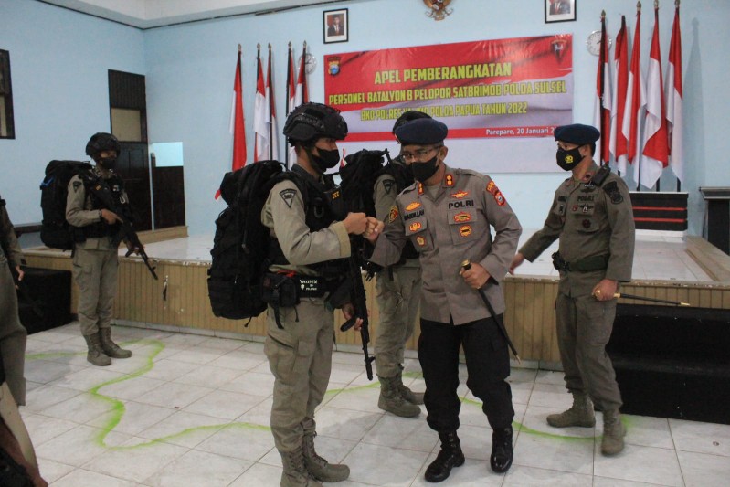 POINSEMBILAN.COM-PAREPARE, Kapolres Parepare AKBP Welly Abdillah, S.H, S.I.K pimpin pelepasan pemberangkatan personel Batalyon B Pelopor Satbrimob Polda Sulsel BKO Polres Yalimo Polda Papua di Aula Mappagiling Batalyon B Pelopor Jl Chalik Kel. Sumpang Minangae Kec. Bacukiki Barat Kota Parepare, Kamis (20/01/2022)