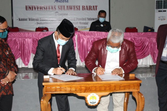 POINSEMBILAN.COM-MAJENE, Kantor Wilayah Badan Pertanahan Nasional (BPN) Provinsi Sulawesi Barat melaksanakan penandatanganan Memorandum of Understanding (MoU) atau Nota Kesepahaman dengan Universitas Sulawesi Barat (Unsulbar) Kamis (29/04/2021). Nota kesepahaman ini untuk menjalin kerjasama dalam meningkatkan dan mengembangkan sumber daya manusia dalam bidang pendidikan, penelitian, dan pengabdian kepada masyarakat untuk menyukseskan program kerja kedua belah pihak.
