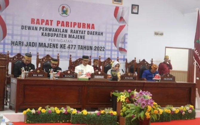 MAJENE– Dewan Perwakilan Rakyat Daerah (DPRD) Kabupaten Majene melakukan rapat paripurna dalam rangka memperingati Hari Jadi ke-477 Majene, Aula Rapat Gedung DPRD kab Majene, Senin (15/8/2022).