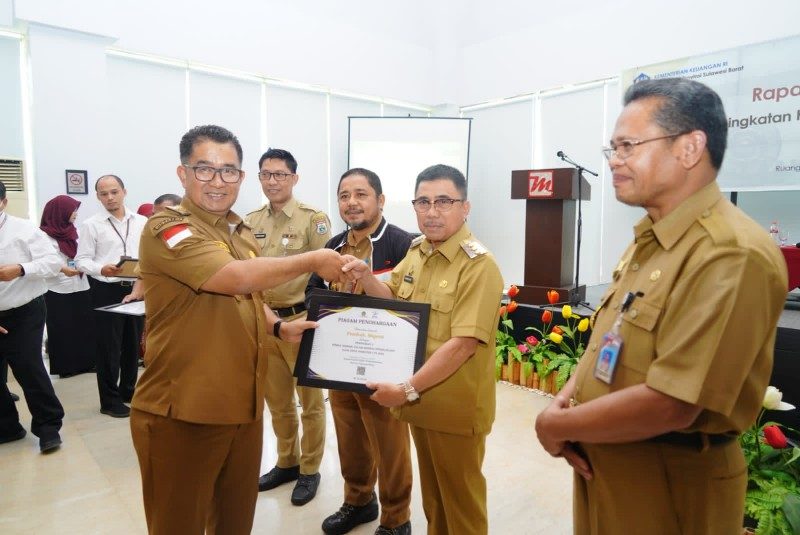 Penghargaan diserahkan oleh pj Gubenur Sulbar Akmal Malik, diterima langsung oleh Bupati Majene Andi Achmad Syukri saat kegiatan Rapat Koordinasi Daerah Peningkatan Kualitas APBN/APBD di Sulbar yang dilaksanakan di Kanwil DJPb Sulbar di Grand Maleo Hotel Mamuju, Senin 29 Agustus 2022.