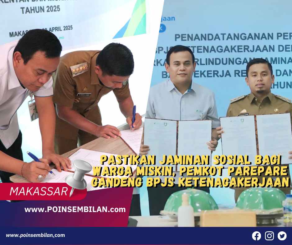 MAKASSAR, Poinsembilan.com — Wali Kota Parepare, Tasming Hamid, resmi menandatangani perjanjian kerjasama dengan BPJS Ketenagakerjaan terkait perlindungan jaminan sosial ketenagakerjaan bagi pekerja rentan dan masyarakat miskin di Kota Parepare untuk tahun 2025.
